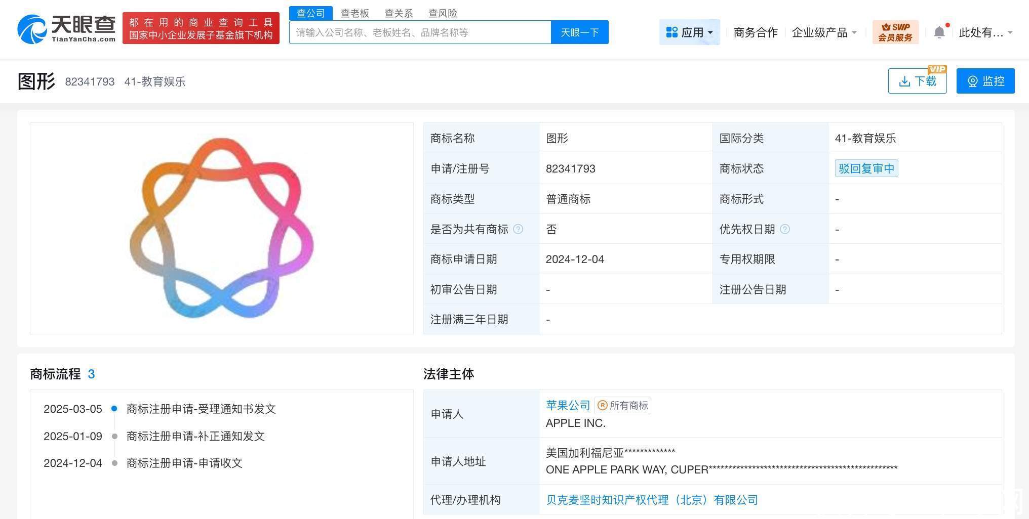 天眼查知识产权信息显示,2024年,苹果公司已在中国申请注册多枚苹果智能相关图形商标,国际分类涉及网站服务、教育娱乐、科学仪器等,当前多枚商标已被驳回复审,部分商标状态为初审公告。